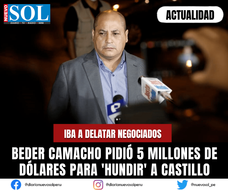 El exsecretario de Palacio, Beder Camacho, pidió 5 millones de dólares para delatar a la Fiscalía los negociados del exministro de Transportes Juan Silva y del sobrino del jefe de Estado, Fray Vásquez Castillo. Alegó tener “documentación” que comprometería a Pedro Castillo.