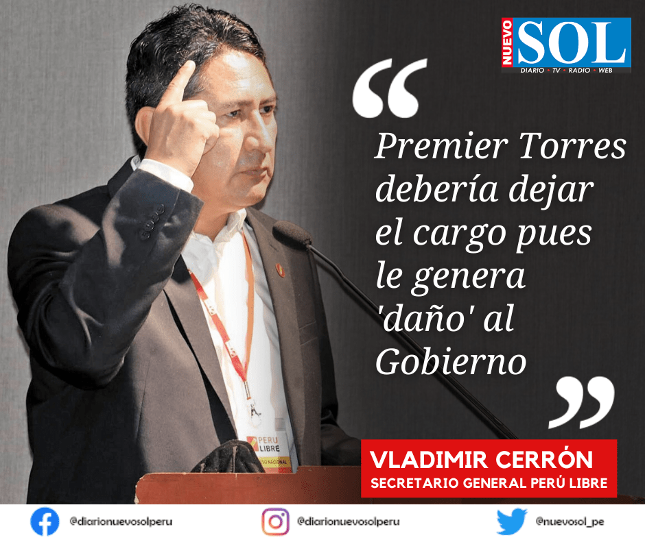 El secretario general de Perú Libre, Vladimir Cerrón, afirmó que el primer ministro Aníbal Torres Vásquez debería dejar el cargo pues genera un “daño” al Gobierno, al “apartar” al mandatario de sus bases populares y del mismo partido, lo cual, según precisó, dificulta que cumpla sus promesas de campaña.