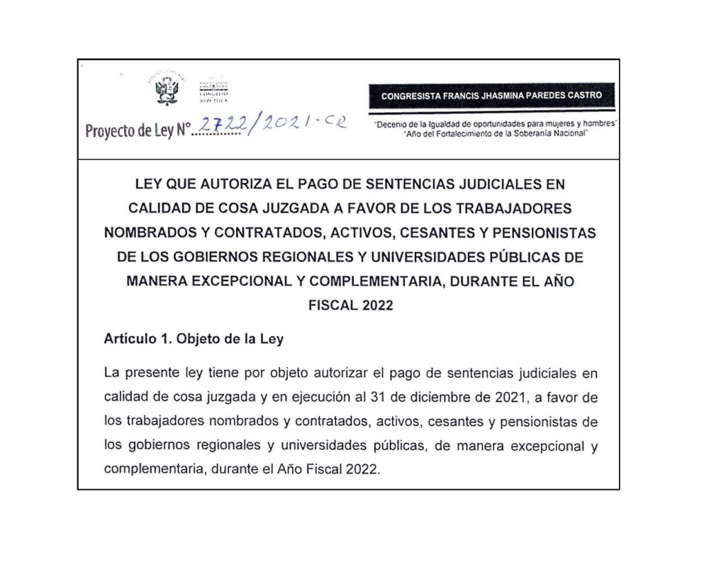 Mediante proyecto de ley N° 02722/2021-CR, ha sido presentado ante el Congreso una propuesta para autorizar el pago de sentencias judiciales en calidad de cosa juzgada a favor de los trabajadores nombrados y contratados, activos, cesantes y pensionistas de los gobiernos regionales y universidades públicas.