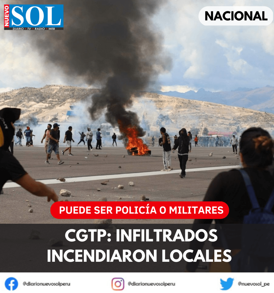 Grupos de infiltrados en las manifestaciones incendiaron diferentes locales de instituciones públicas y privadas en Huamanga, señaló Roger Lima, secretario general de la CGTP de Ayacucho.
