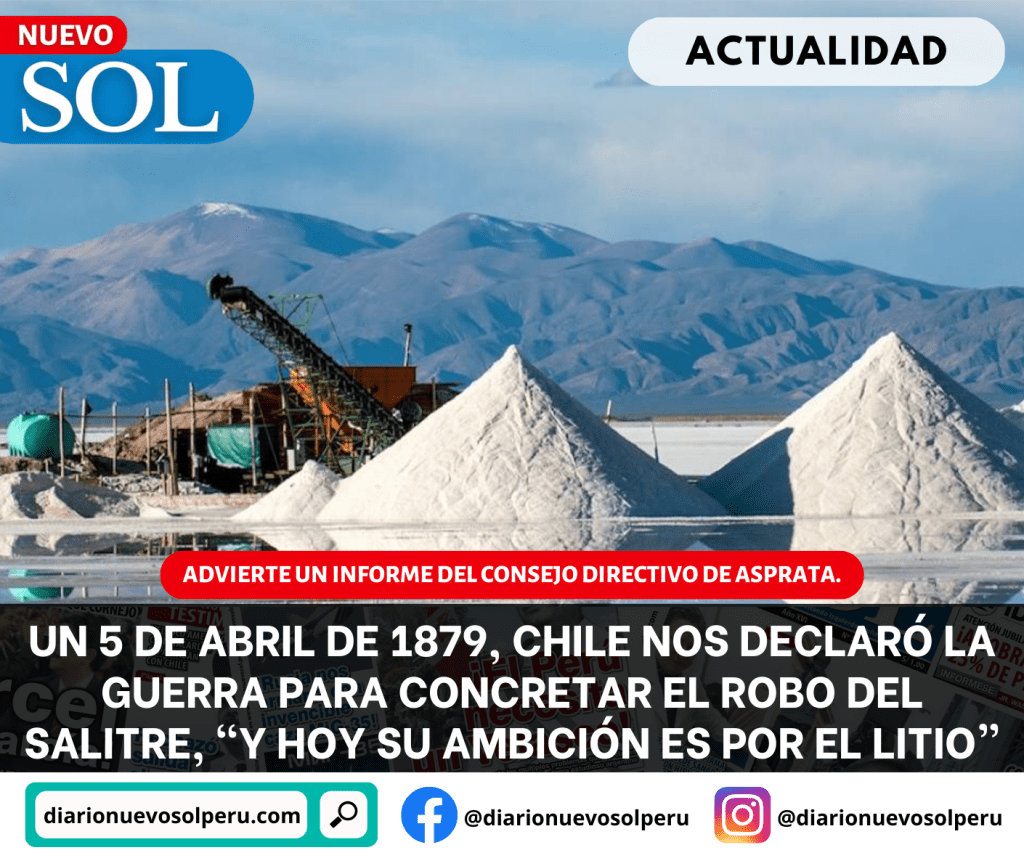 Un 5 de abril de 1879, hace 144 años, Chile nos declaró la guerra para concretar el robo del salitre, “y hoy su ambición es por el litio”, advierte un informe del consejo directivo de ASPRATA.