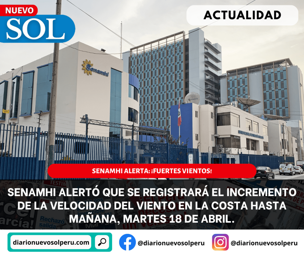El Servicio Nacional de Meteorología e Hidrología (Senamhi) alertó que se registrará el incremento de la velocidad del viento en la costa, desde Áncash hasta Tacna, hasta mañana, martes 18 de abril.