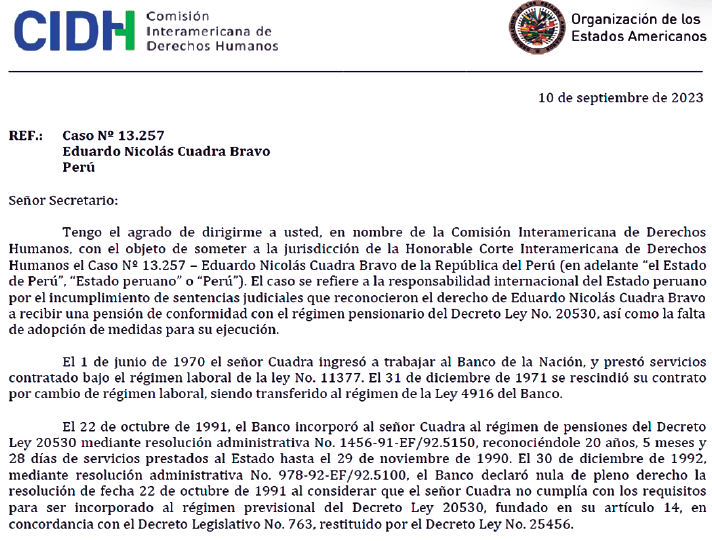 Esto, luego que la Comisión Interamericana de Derechos Humanos (CIDH) les hiciera de conocimiento el incumplimiento de sentencias judiciales a favor del derecho de Eduardo Nicolás Cuadra Bravo a recibir una pensión.